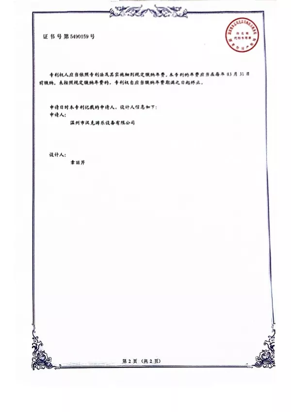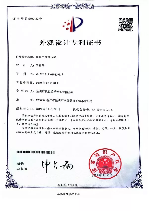 Ngasikhathi sinye, njengomkhiqizo wokuphathelene kwe-Hank, safaka isicelo sesitifiketi se-Design Patent se-Zebra esenziwe nge-Percussion Standated Standad Metent Standant ngonyaka we-2019 futhi sathola imvume evela ehhovisi leProfesa lezentengo lamaShayina.